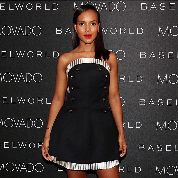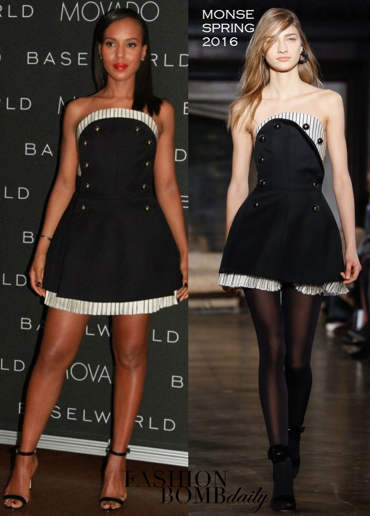 Kerry Washington tended to her duties as a Movado Brand Ambassador at Baselworld. For the occasion, she showed off her toned legs in a Monse Spring 2016 Black Strapless Button Accented Dress: