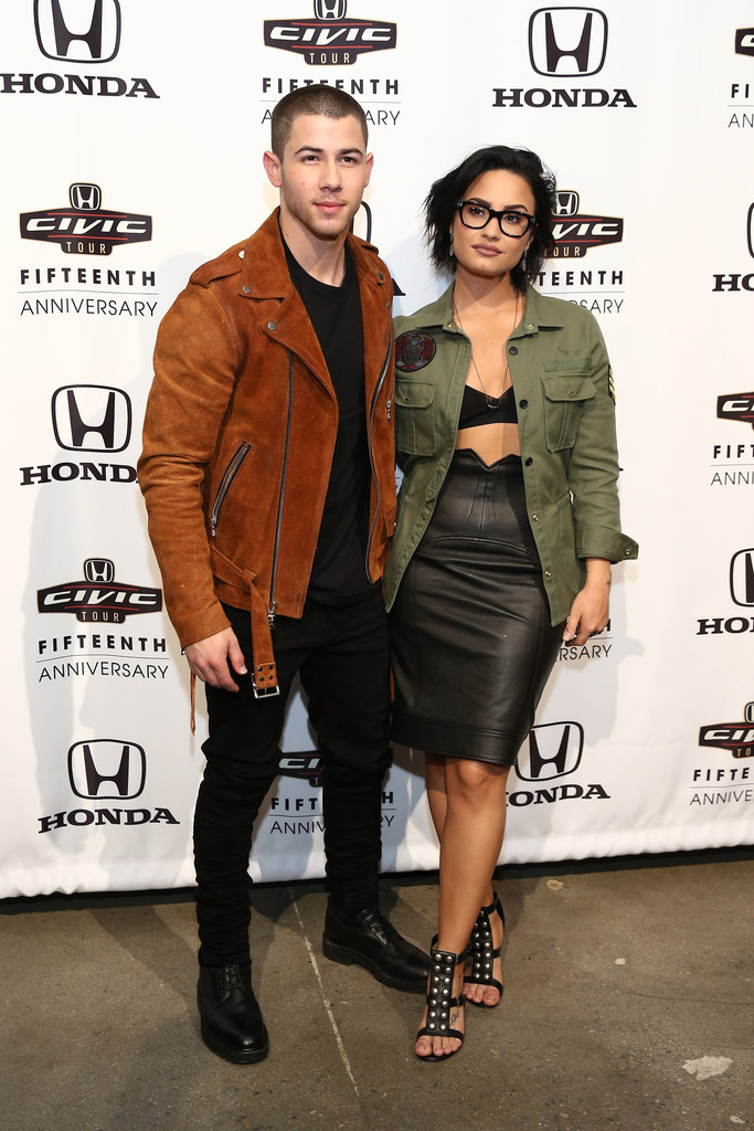 Demi Lovato was spotted at the 2016 Honda Civic Tour Artists Announcement alongside Nick Jonas in a $428 Zadig & Voltaire Army Overshirt, Tom Ford Black Leather Pencil Skirt, and Saint Laurent Studded T-Strap Sandals: