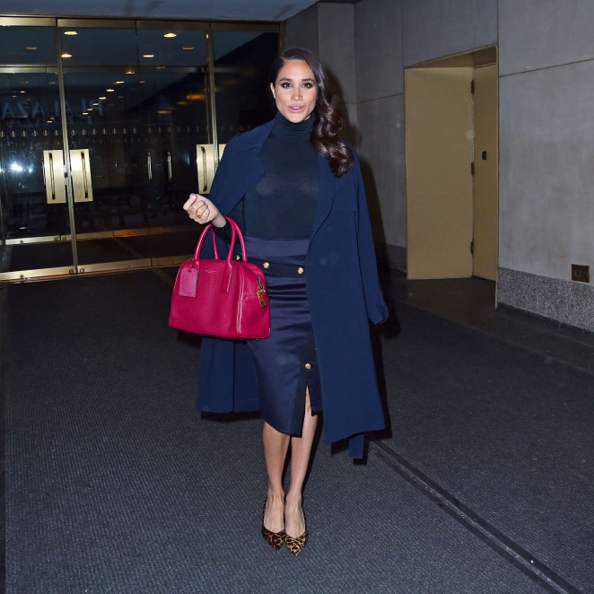 Meghan Markle made an appearance on the Today Show in a $430 Veronica Beard Navy Paradise Pencil Skirt, $550 Marc Jacobs Merlot Gotham Bauletto Bag, and $750 Sarah Flint Chocolate Leopard Emma Pumps: