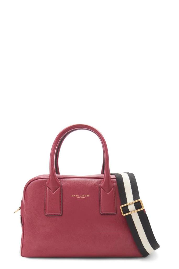 Her grainy pebbled leather bag features a webbed cross body strap accented by racing stripes, long rolled carry handles, a logo tag and a top zip closure.