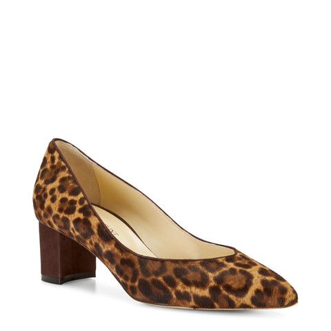 Her pumps feature functional 2″ heels and leopard calf hair uppers.