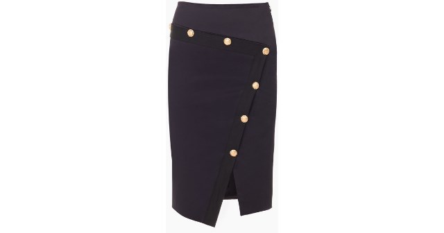 Her navy pencil skirt boasts brass buttons, grosgrain-trim, and a front slit.
