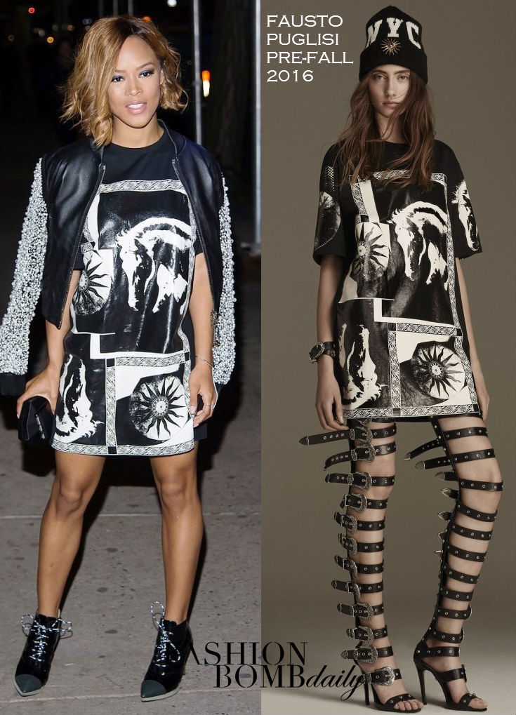Serayah celebrated at the Empire Covergirl Collection Launch in a Philipp Plein Embellished Sleeve Leather Jacket, Fausto Puglisi Pre-Fall 2016 Black and White Printed Leather Mini Dress, and Pollini Cap Toe Booties: