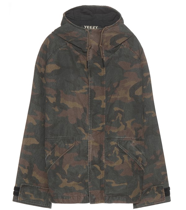 Her green and brown coat hails from Yeezy’s Season 1 collection. It features an oversized fit, camouflage print, concealed zipped front, snap button fastenings, zipped side pockets, and velcro cuffs.