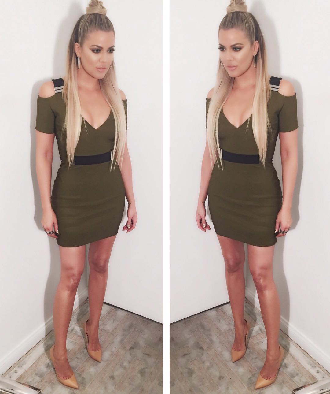 For her latest Kocktails With Khloe ensemble, Khloe Kardashian sported a $1,975 Mugler Army Green Cutout Embellished Stretch Crepe Mini Dress. Naturally, she documented it for the ‘gram: