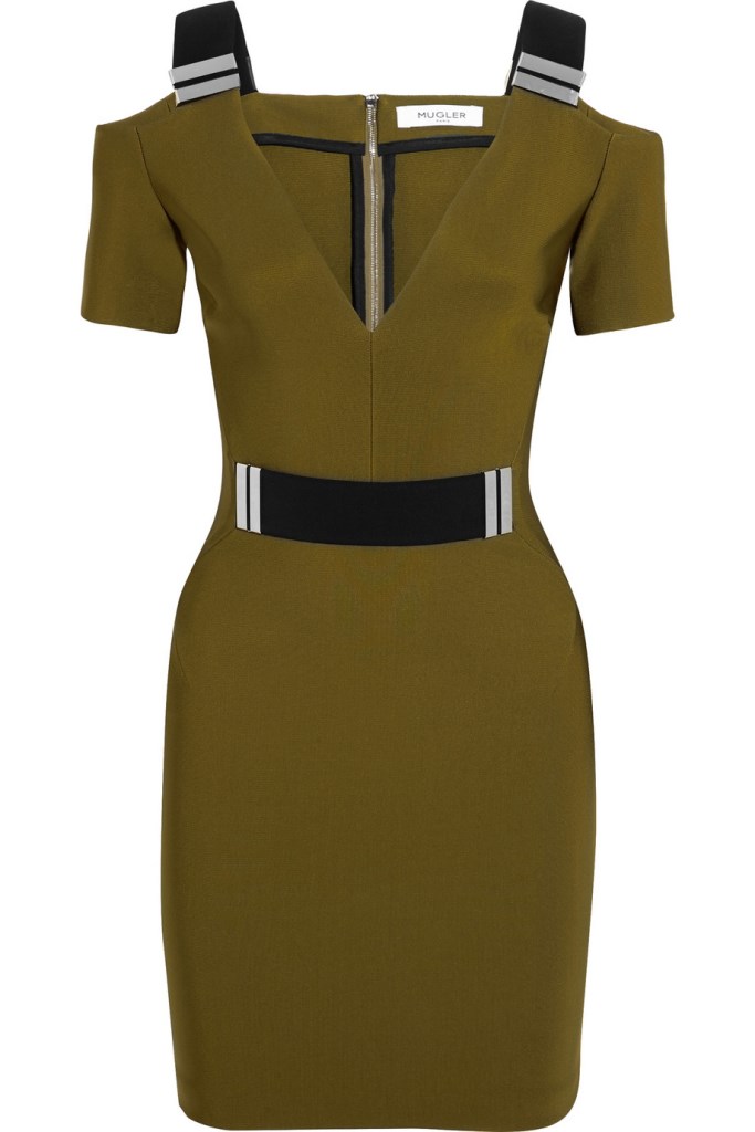 Her army green stretch-crepe dress hails from the brand’s Spring 2016 collection. It features a curve-hugging fit, military-inspired detailing, cutouts, and contrast black trim.