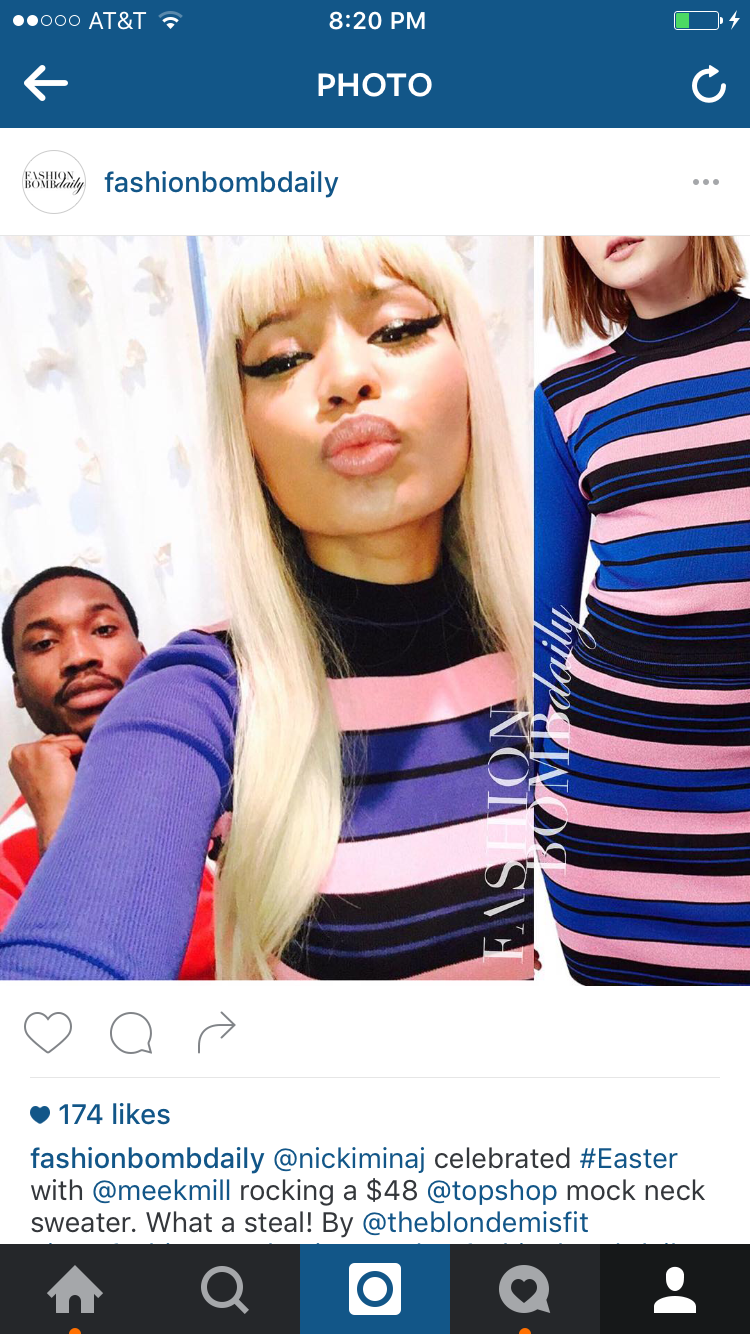 Nicki Minaj posted for Easter with boo Meek Mill, and we could tell from the photo she was rocking this $48 Topshop Hyper Color Stripe Mock Neck Sweater: