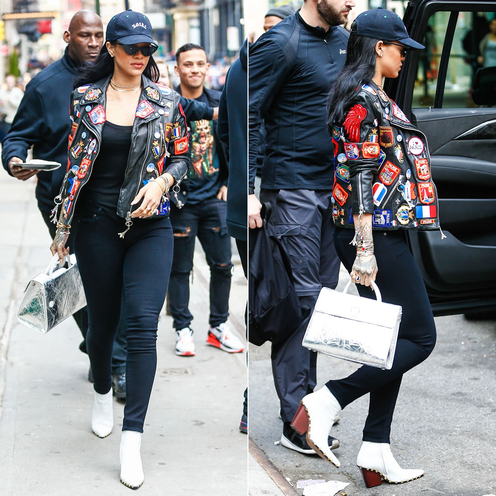 The fabulous Rihanna was spotted in Soho rocking a custom Dries Van Noten motorcycle jacket, $1,750 white Celine ‘Rodeo’ high ankle Spring/Summer 2016 boots, and a silver Christian Dior ‘Diorever’ tote: