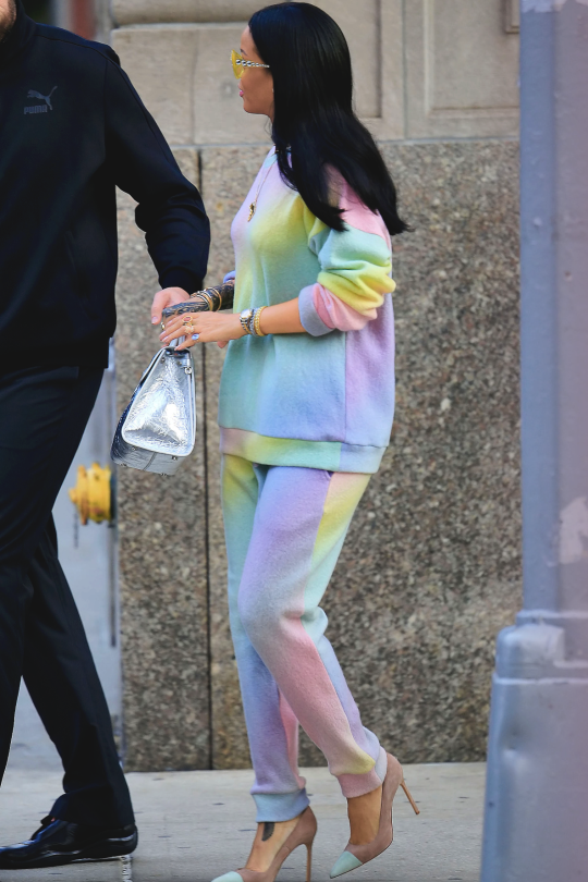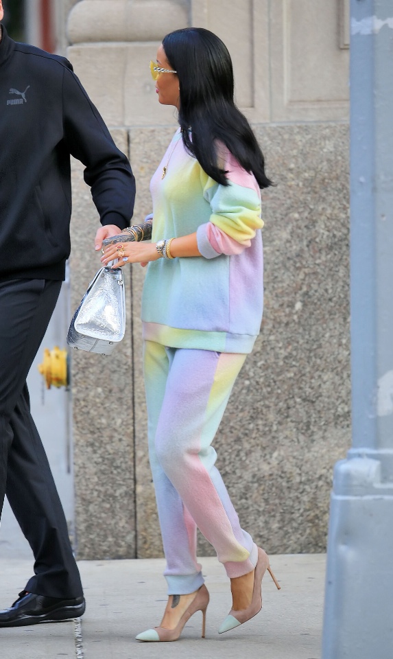 Rihanna was spied leaving her Soho Apartment earlier today in a Rainbow Hued Pants Set from The Elder Stateman’s Spring 2016 collection: