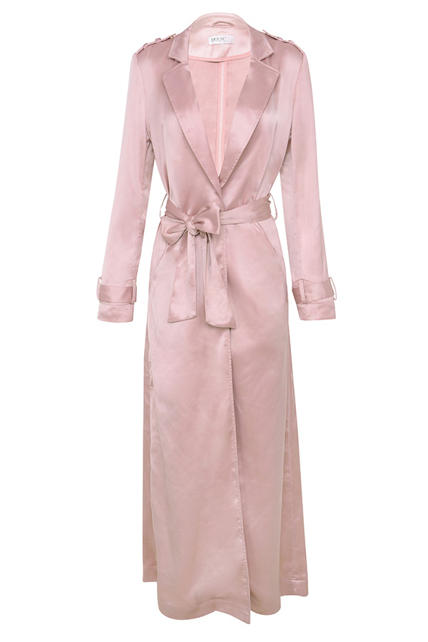 Her duster features rose-gold coloring, and is made from satin. It also features a long line length, full sleeves, and a tie wrap.