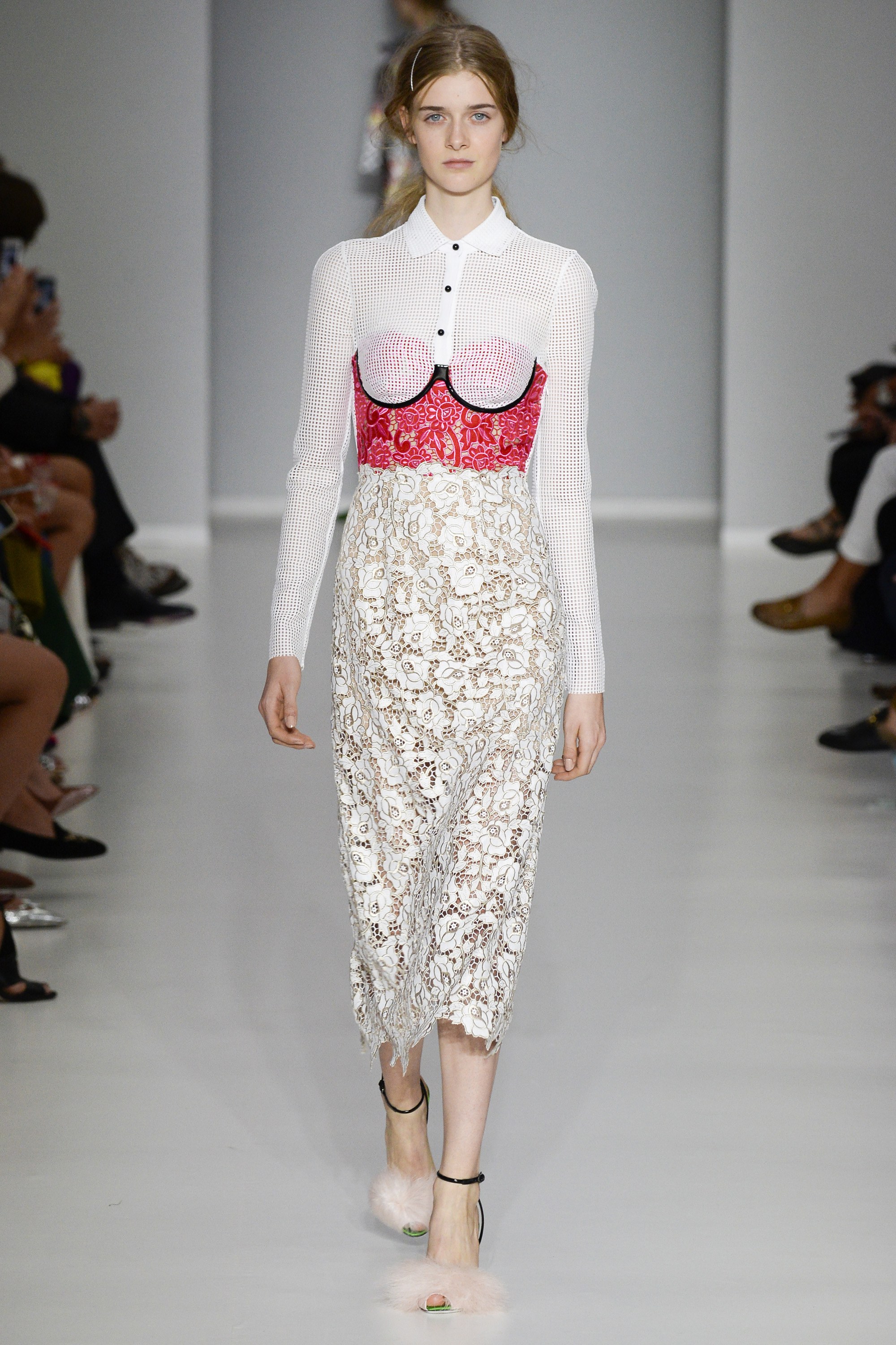 The dress features a high-collar button-up, as well as strong under-wiring in the bust area. Under the wiring, the long-sleeve dress flows from red to tan to then an off-white lace, where it finishes off sheer.