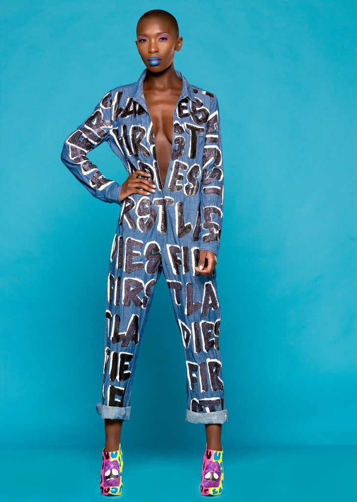 The denim utility jumper features ‘Ladies First’ in large black and white, hand painted print.