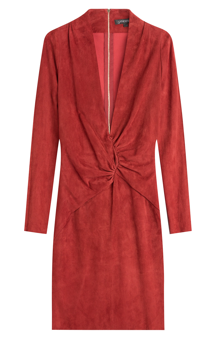 The red lambskin suede dress features a plunging V-neckline, gathered material at the waist to accent, and a zipped back.
