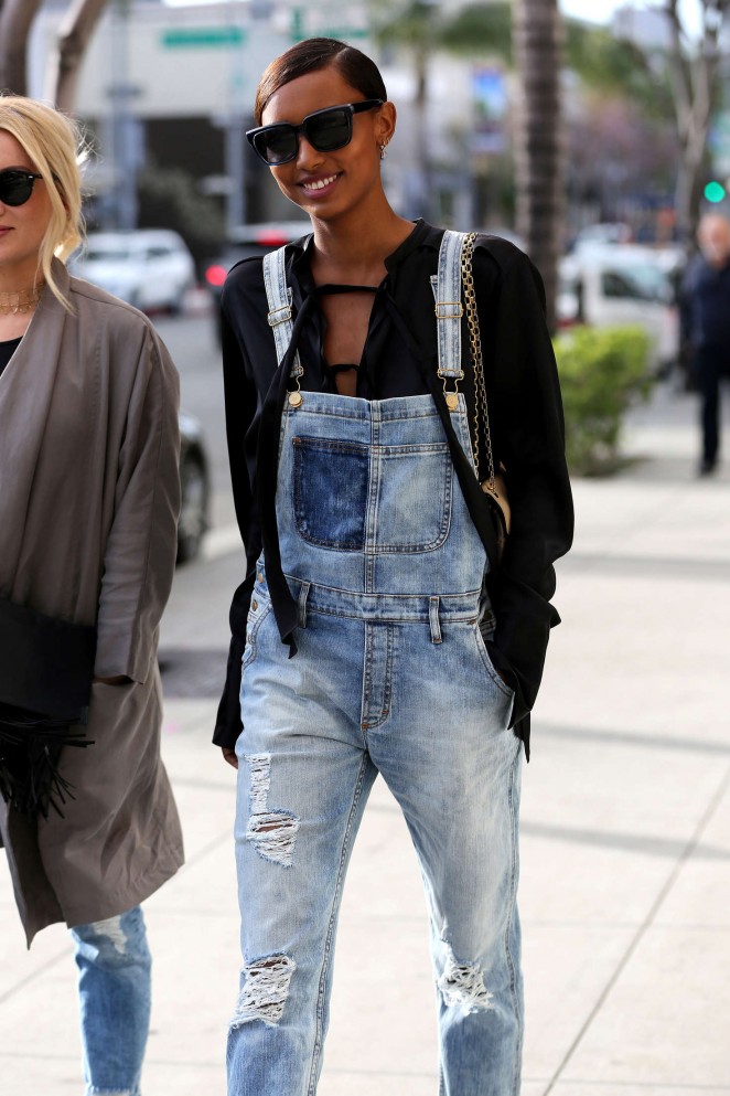 Jasmine Tookes grabbed a bite to eat at Il Pastaio—looking every bit the supermodel in a Ports 1961 Black Silk Lace Up Blouse, Don’t Cry Denim Overalls, and Le Silla Lace Up Leopard Booties: