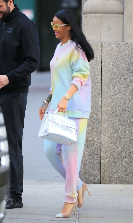 Rihanna’s ANTI Tour is on fire! Although I’ve yet to cop my tickets, I’ve heard amazing things. Earlier this week, the songstress was spotted out and about in an eccentric rainbow hued pant set by The Elder Statesman. RiRi accented her look with Manolo Blahnik pumps and Moschino sunnies. Yes!