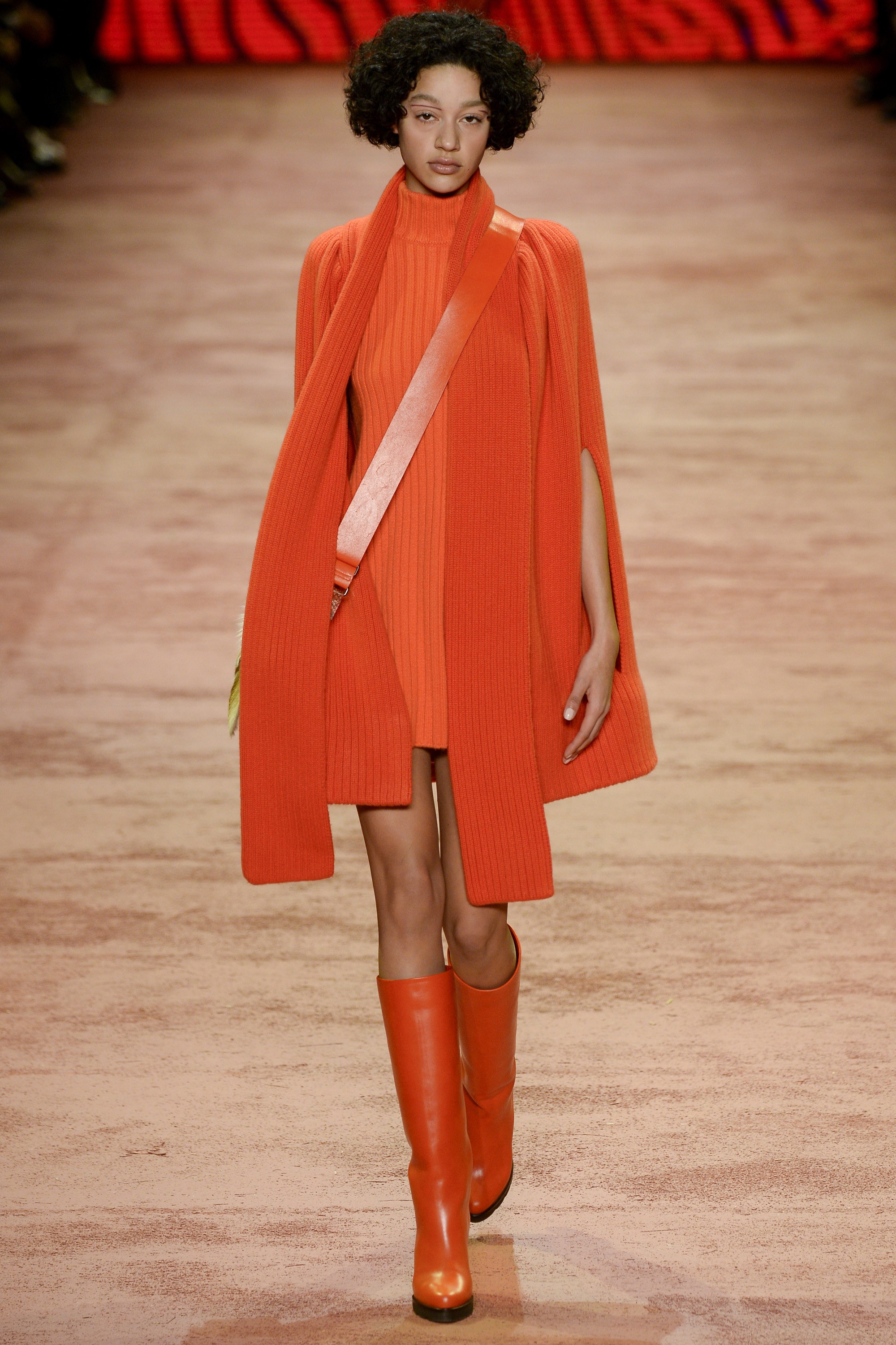 Her dress was paired with an orange monotone cape, matching boots, and a coordinating crossbody bag.