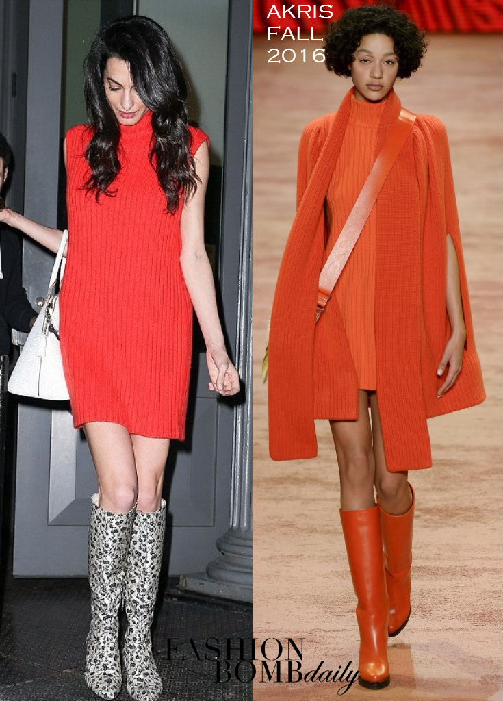 Amal Clooney went bold while out and about in NYC—wearing an Akris Fall 2016 Orange Ribbed Cashmere Tunic Dress and $2,995 Maison Margiela White 5AC Tote Bag: