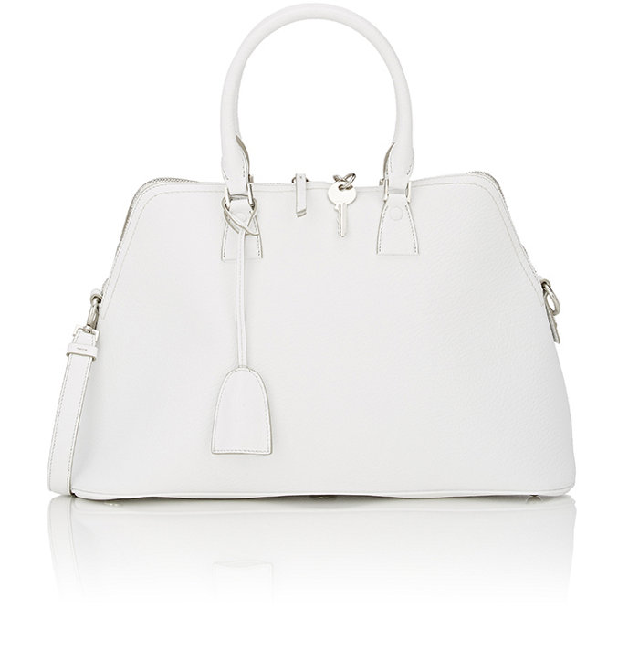 Her white grained leather bag can be carried as a shoulder bag, crossbody bag, or handheld satchel: talk about versatility! The shoulder strap can also be attached to the exposed lining, the bag’s body, or removed altogether for more wearing options.