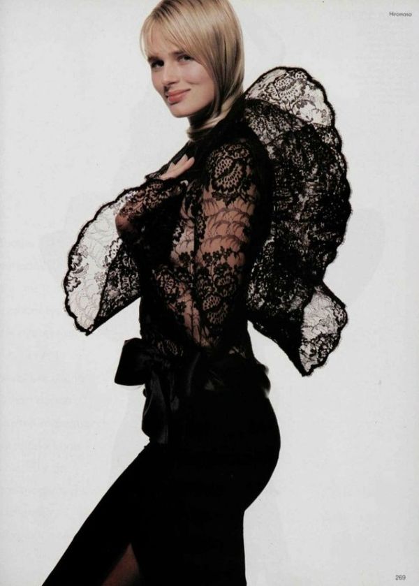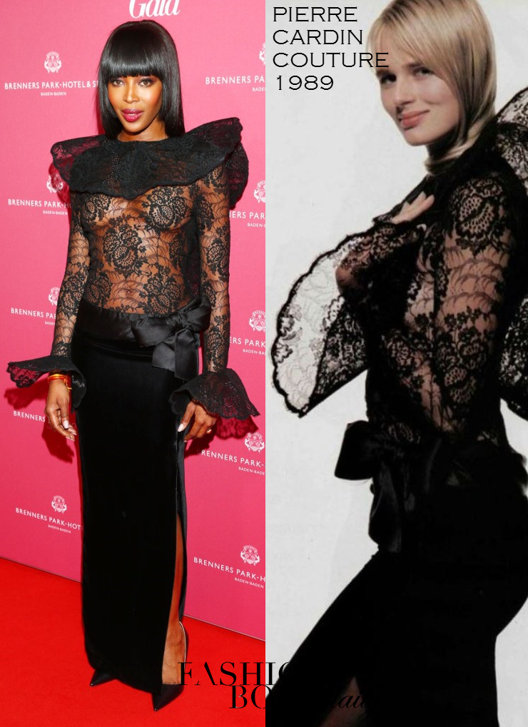 Naomi Campbell looked every bit the model at the Gala Spa Awards in a 1989 Pierre Cardin Couture Black Ruffle Lace and Velvet Slit Gown:
