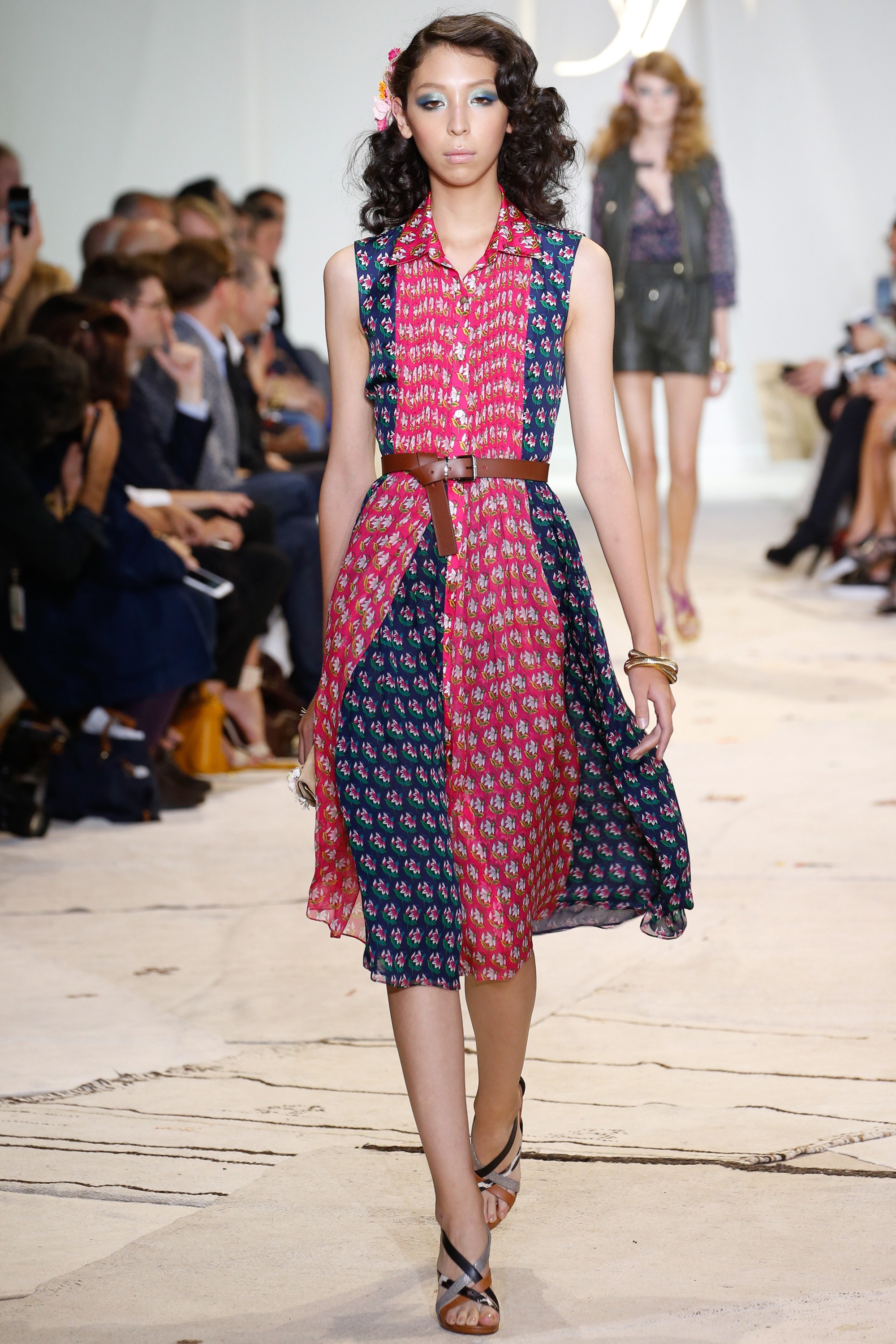 The spring-ready piece was showcased on the runway with a brown leather belt and neutral strappy sandals.