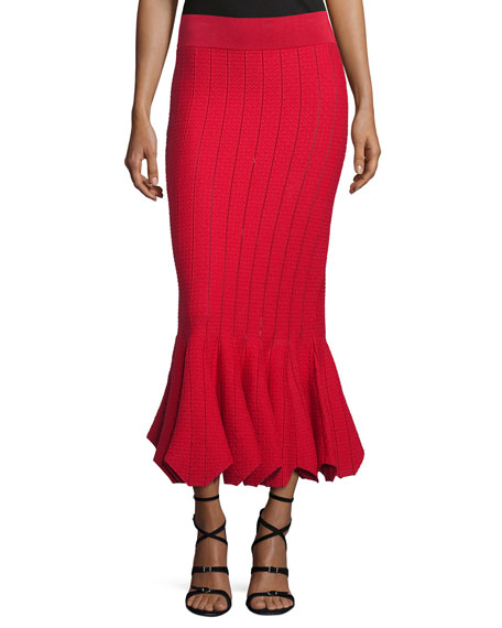 Her matching skirt features a curve-hugging fit and a flared hem.