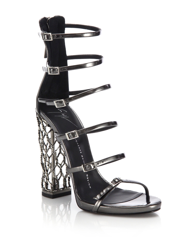 Her sandals feature 4.75″ metal cage heels and buckled strap detailing.