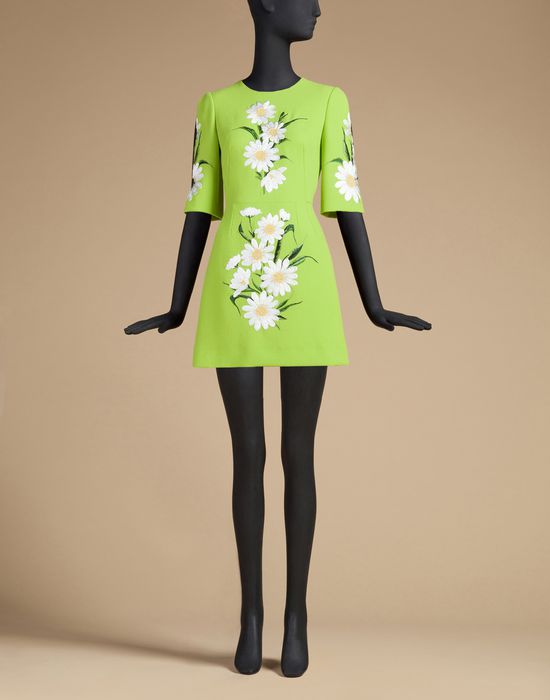 Her green wool trapeze dress features daisy embroidery, a round neckline, darted bodice, short flared sleeves, and an A-line skirt.