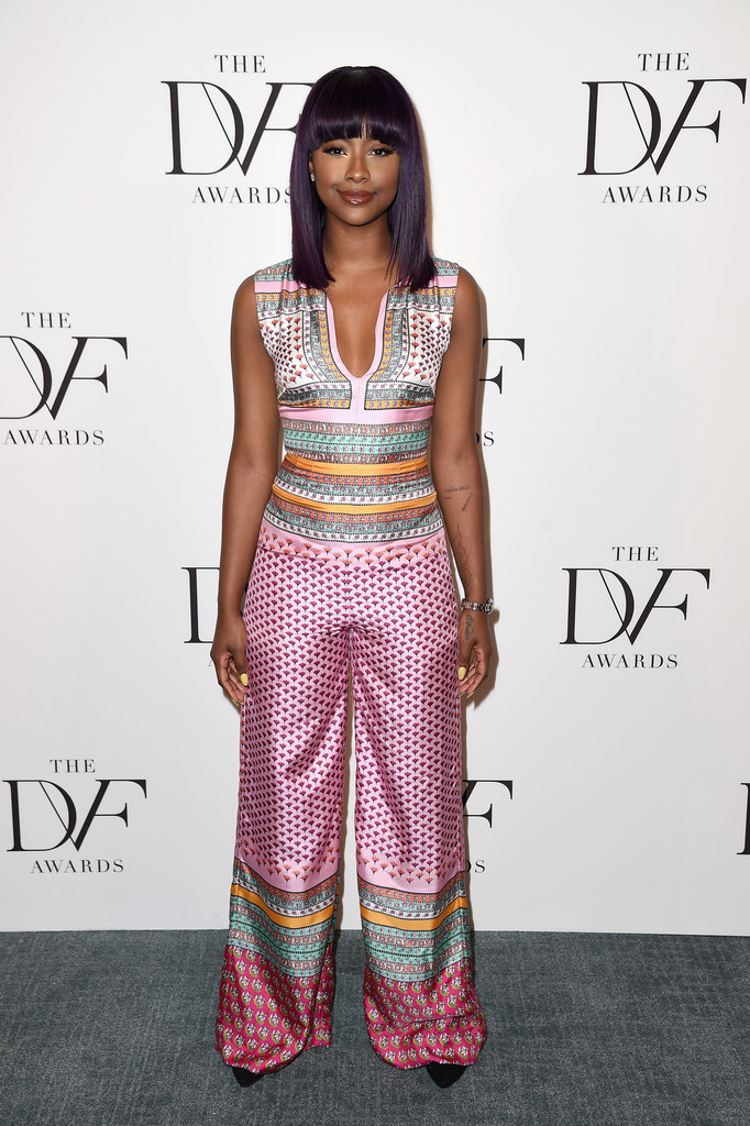 It was all about prints for Justine Skye in a $696 Diane von Furstenberg Jalessa Jumpsuit. I would’ve preferred a pair of ankle-strap sandals here, but both she and the jumpsuit are gorgeous.