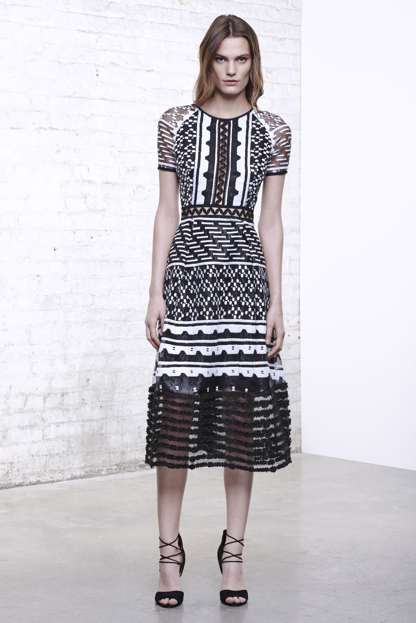 The black and white mixed patterned dress features hidden sheer panels on the chest, sleeves and hem.