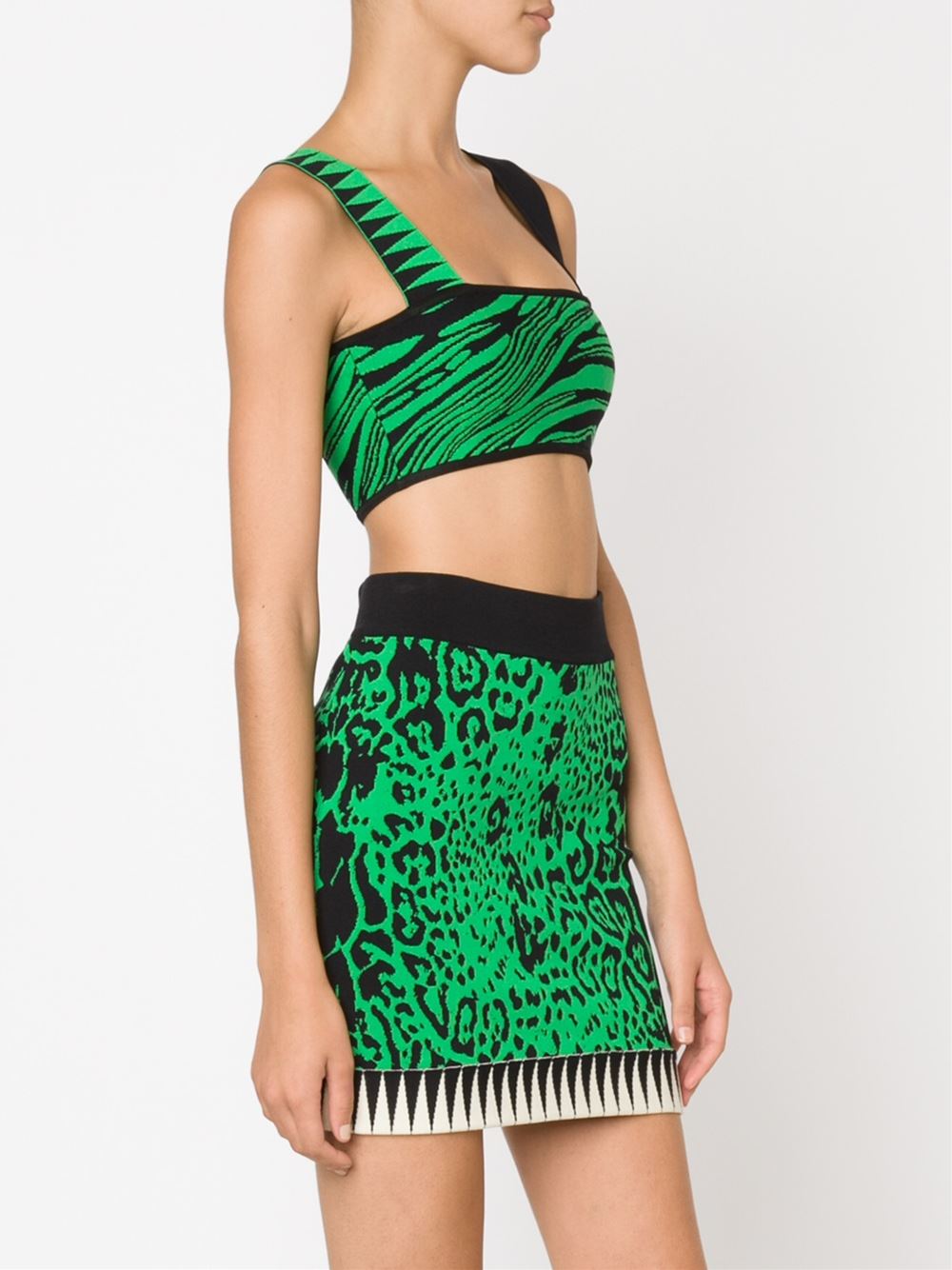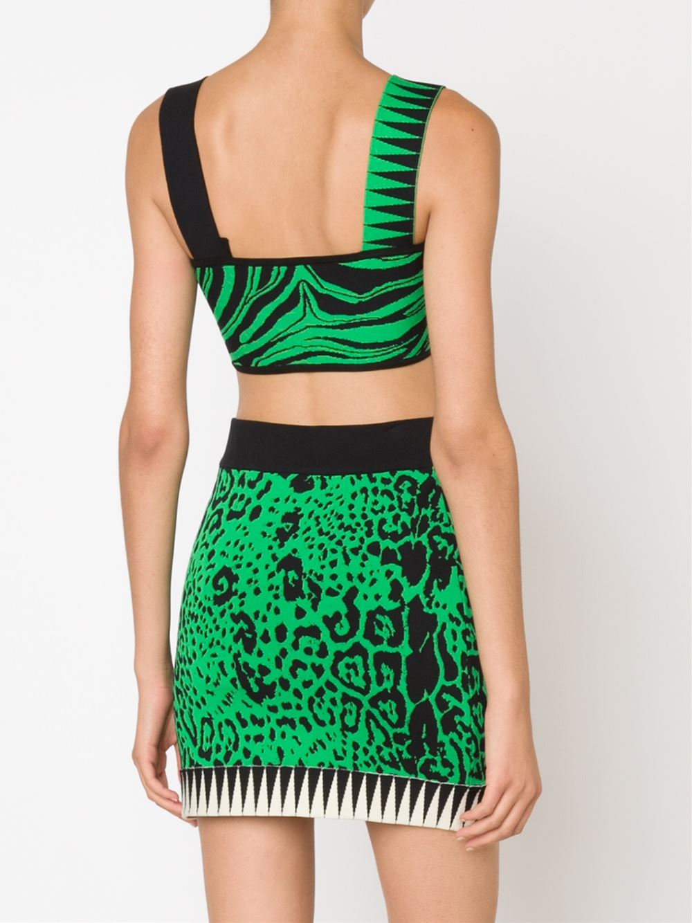 The green and black zebra print bralette features straps with solid and triangle detailing. Contrasting in patterns, the matching leopard skirt has black and white trimming on the hem, similar to the strap.