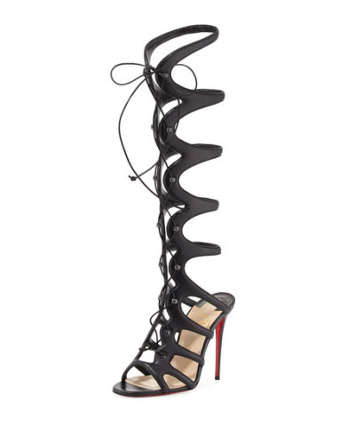 The Amazoula open-toe, caged, lace-up sandals are adjustable at the knee with self-tie laces. Nicki’s gladiator style shoes have a 4 inch heel and fall a few inches below her knee.