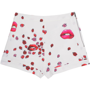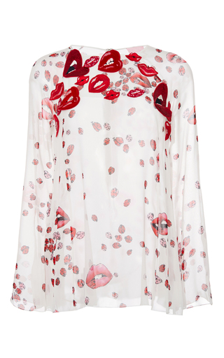 Her ivory colored, sheer silk blouse features lip prints and ladybugs dispersed on the loose fitting top.