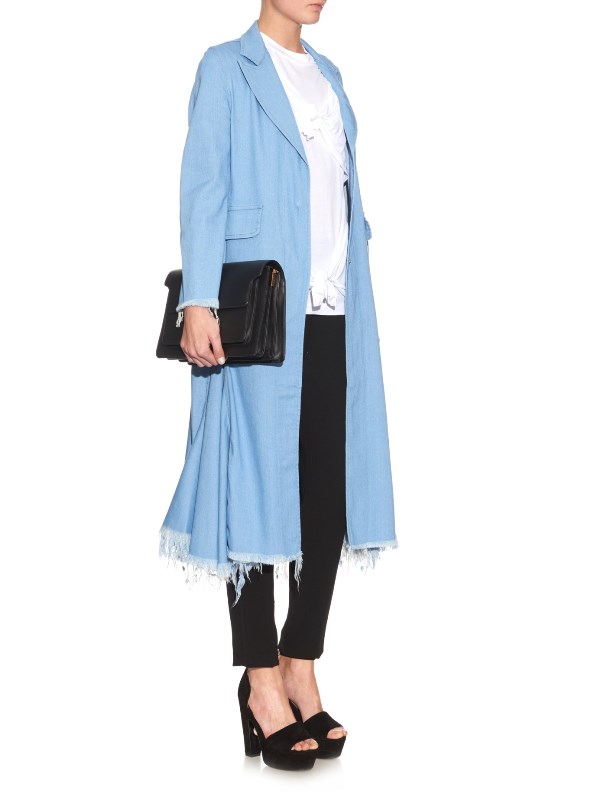 Her light blue denim coat boasts notch lapels, long sleeves, frayed cuffs, flapped front pockets, a single-breasted silhouette, and concealed press-stud fastening.