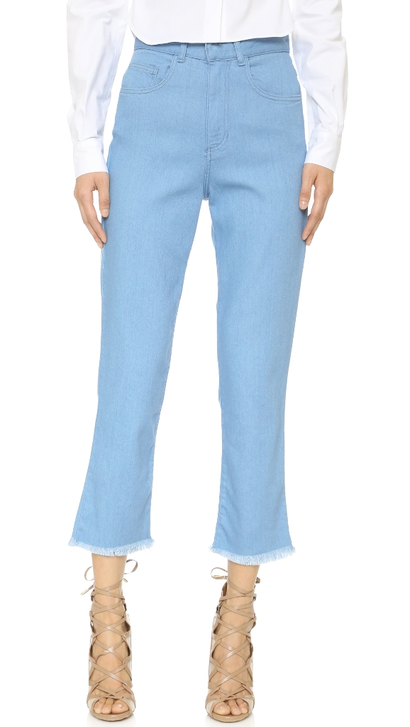 Her matching super-stretch denim features a cropped length, high-rise, skinny legs, raw cuffs, 5-pocket styling, a single-snap closure, and zip fly.