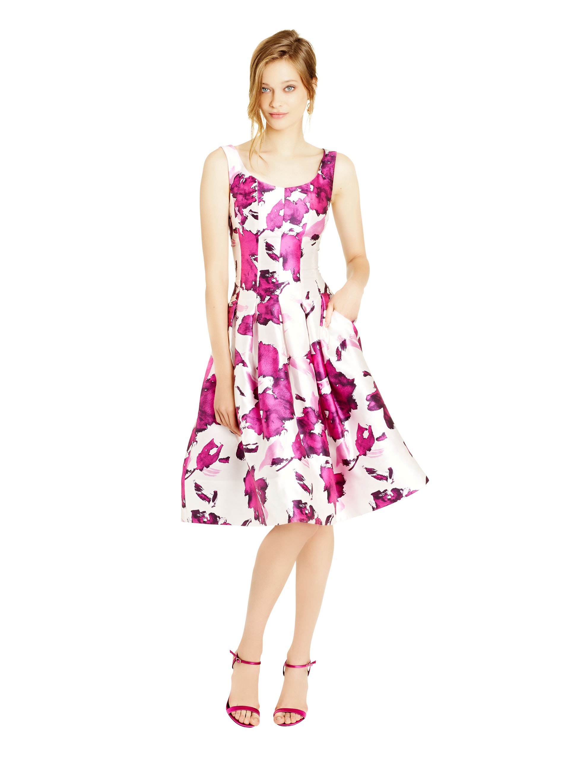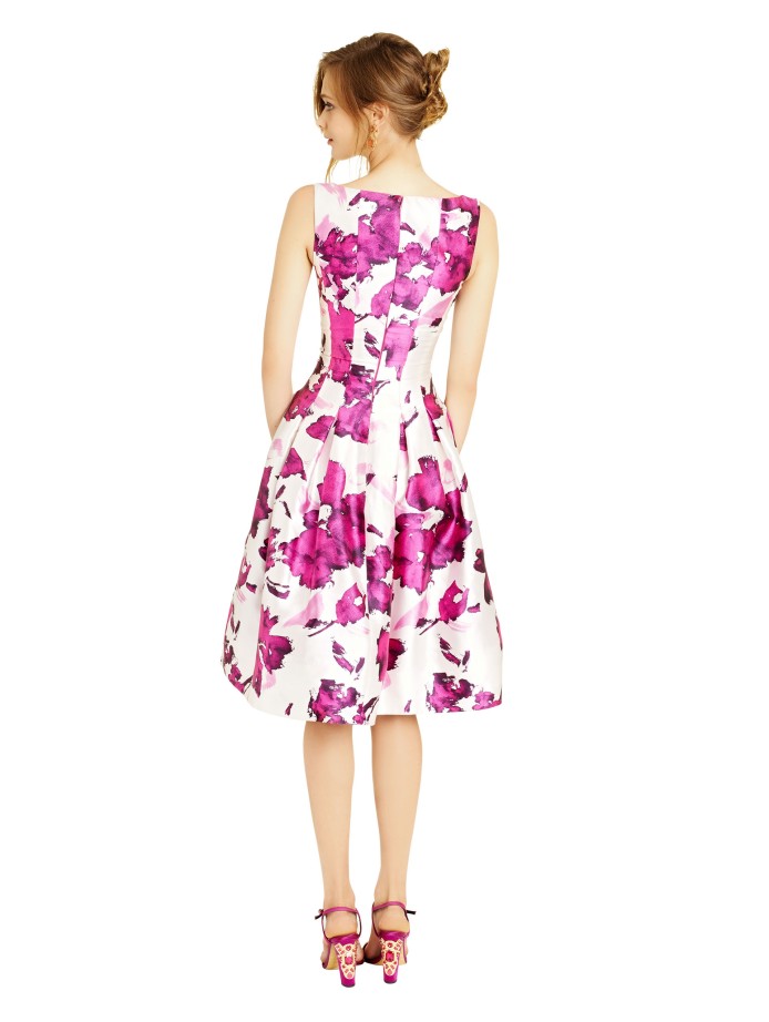 The dress is crafted from silk mikado, features a scoop neck, stitched panels on the sides and a full A-line skirt. Magenta floral embroidery happens throughout.
