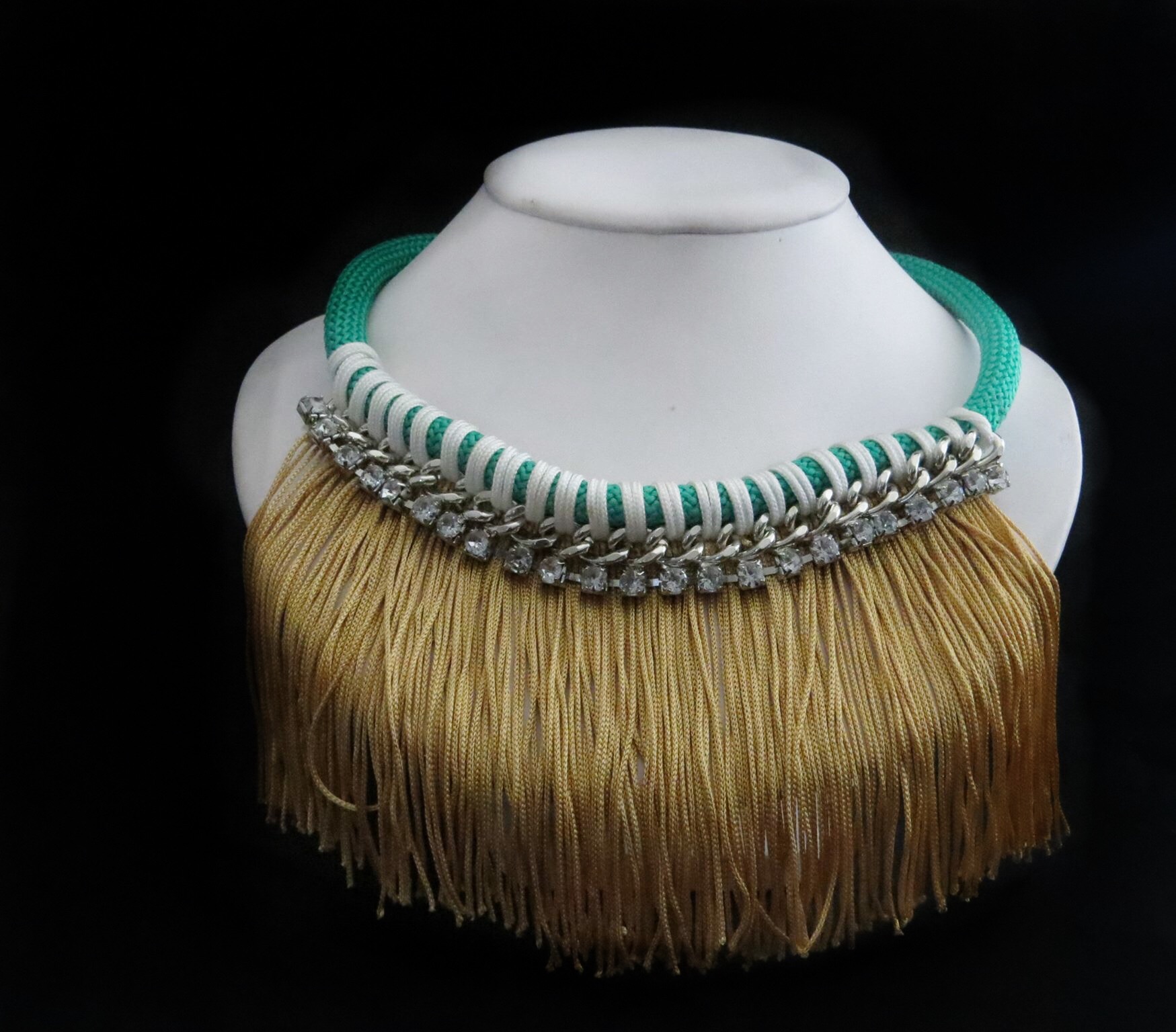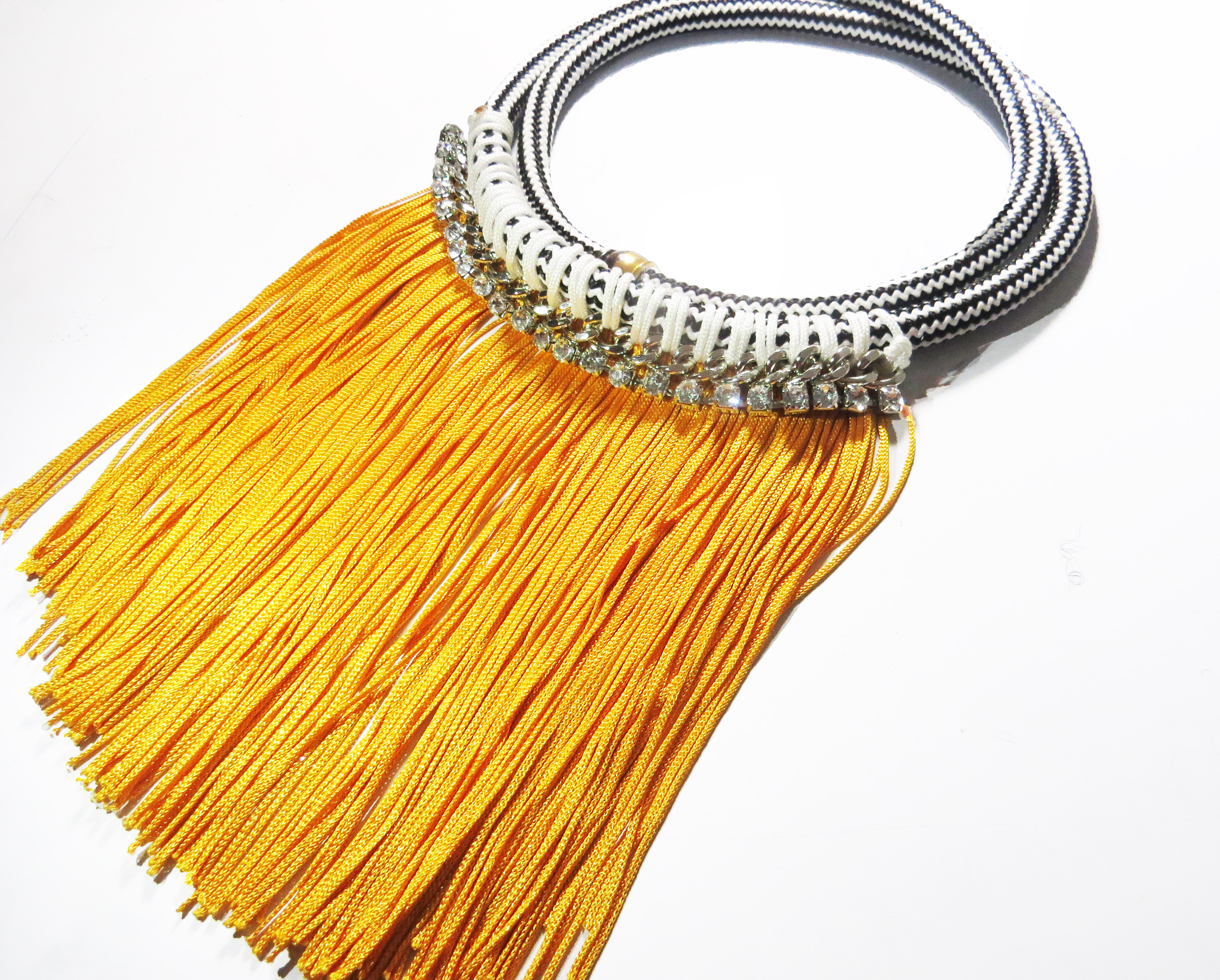 The black and white tribal inspired necklace is long enough to hang on the neck or you can switch it up and wear it as a choker. With bold, fringe detailing, rhinestones and thin rope material, the handmade necklace is fit for a festival setting.