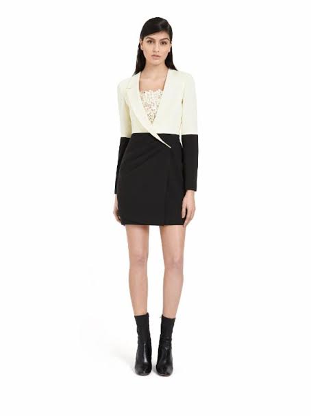 Kerry’s black and white, color block tuxedo style dress features an underlying sheer and lace bodice.