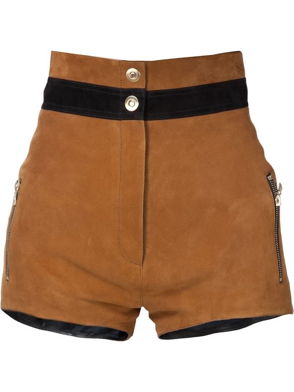 Her matching suede shorts feature a contrast waistband.