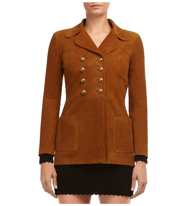 Her suede blazer boasts round lapels, a sailor-inspired button closure, and two flap pockets. Check out the long-line version below.