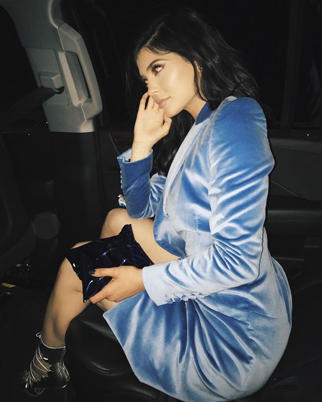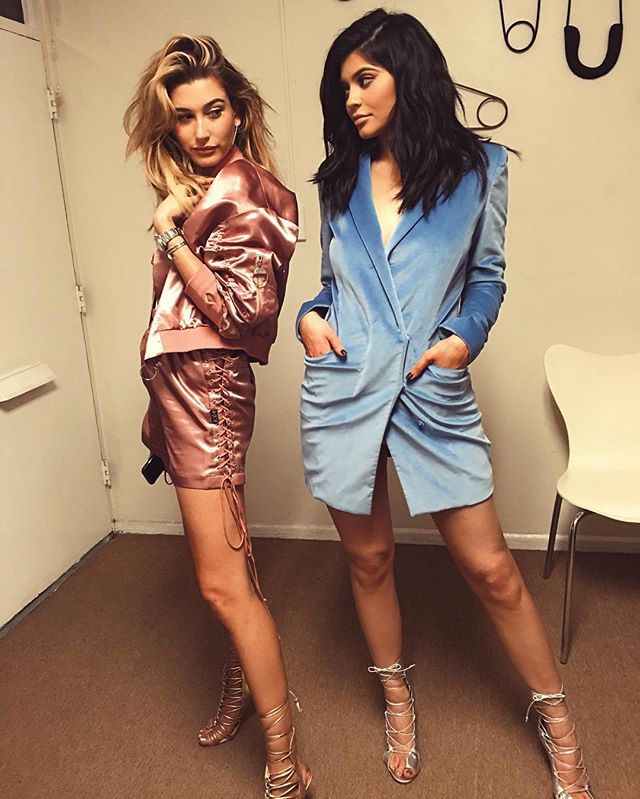 Kylie Jenner took to Instagram with gal pal Hailey Baldwin while donning a Barbara Bui Pre-Fall 2016 Soft Blue Blazer Mini Dress and $550 Monika Chiang Vesta Sandals in Silver Mesh Calf.
