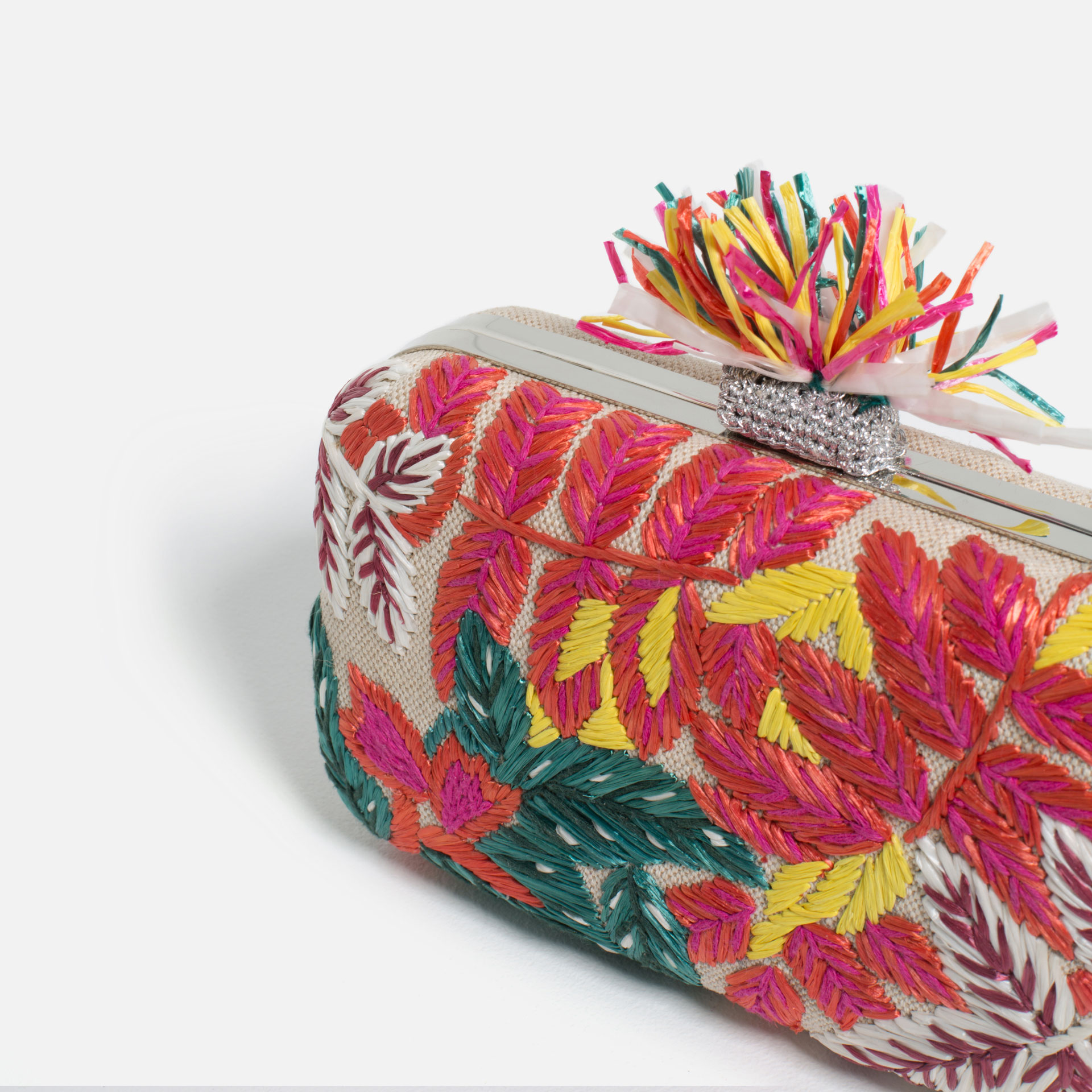 The small, straw-embroidered clutch features pink, orange, yellow, green, white and crimson flower petals on the front. A metallic clasp with a multi-color frayed top is used for closure.