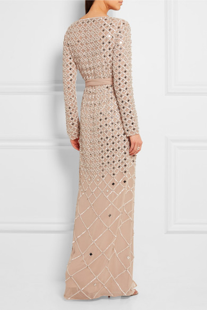 The long sleeve embellished gown is crafted from silk chiffon and boasts a deep v-neck and belted waist.