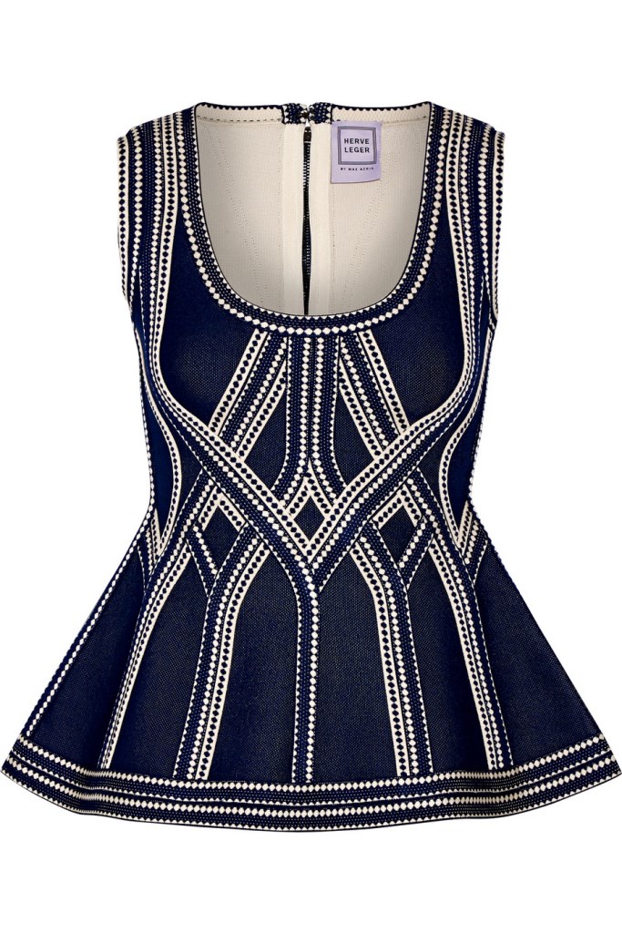 Her storm blue and white stretch-jacquard top features peplum detailing, a nipped-in waist, and a scoop neckline.