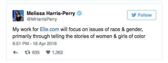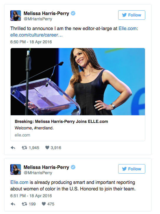 Melissa Harris-Perry, the scholar-turned-television host for an MSNBC political show, was recently named Elle.com’s Editor-at-Large. Editorial director Leah Chernikoff says Ms. Harris-Perry will “focus on the intersection of race, gender, politics, and yes, even fashion, telling the often-overlooked stories of women and girls of color right here on ELLE.com.”