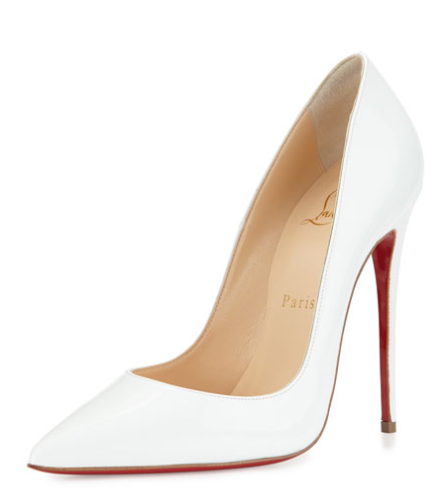 Her Christian Louboutin ‘So Kate’ patent leather pumps feature a 4.8″ covered heel and pointed toe. The low-cut vamp visually lengthens her legs.