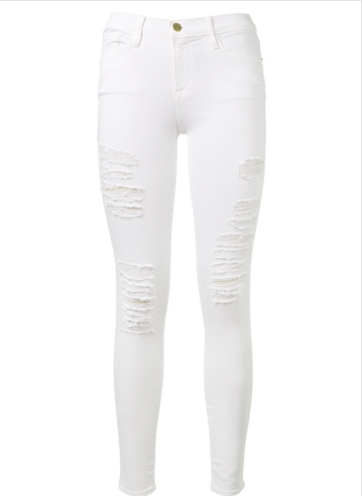 This bodysuit is designed for a flawlessly smooth and seamless finish. It’s specially knitted so the cotton fibers sit softly on your skin, while the outside has an elegant sheen. Her Frame Denim Le Skinny de Jeanne white mid-rise jeans feature distressed effects at legs and knees. The skinny fit comfortably hugs the curves. Khloe injected a pop of pattern with her Valentino ‘Rockstud Camo’ flap clutch. Gleaming pyramid studs outline a sleek flap clutch patterned in swirling camo for a military-chic vibe. It features a magnetic-strap flap closure and a wrist strap for easy toting.