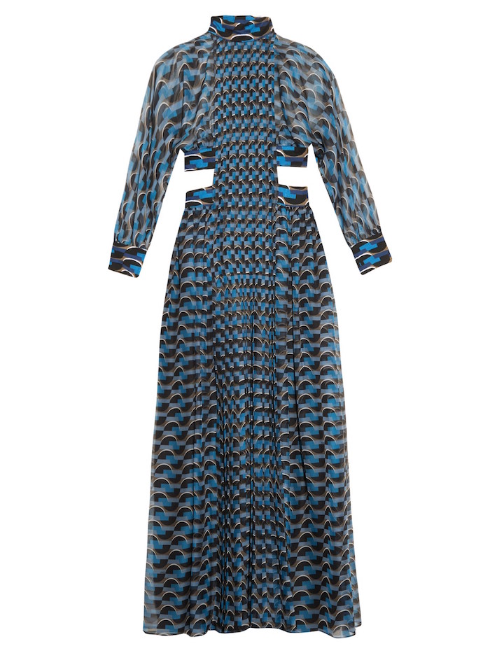 It’s printed with a nostalgic blue, black, white and khaki geometric pattern, and shaped with a high neck, billowing sleeves, and a flattering cut-out at the waist.