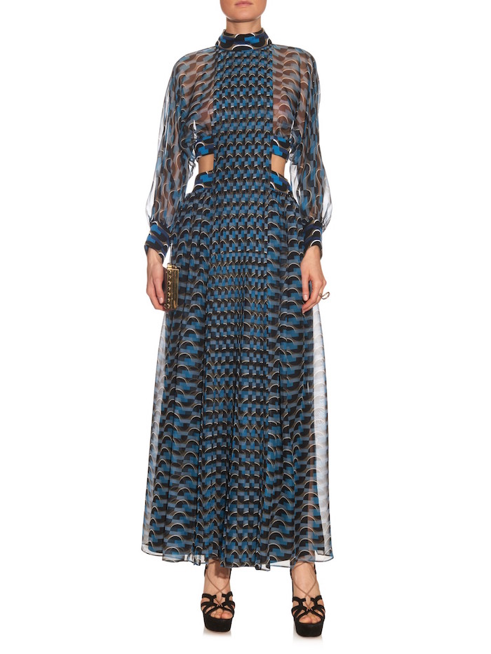 Lindsay Lohan took to the 2016 Asian Awards in London cloaked in a $3,968 Spring 2016 Fendi Geometric Print High Neck Cut Out Side Long Sleeve Maxi Dress
