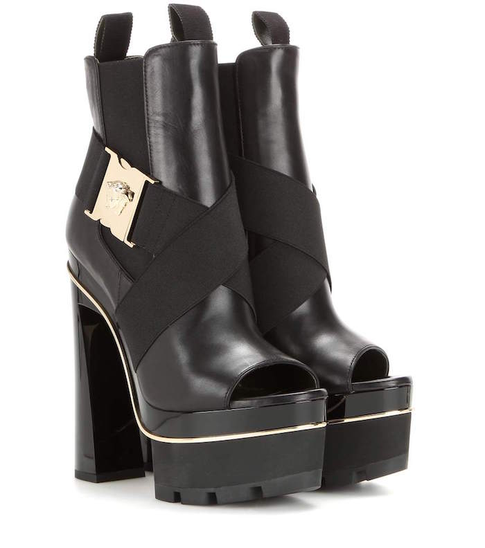 Elasticated straps wrap around the smooth calf leather upper and fasten with the brand’s signature golden Medusa head motif safety buckle.