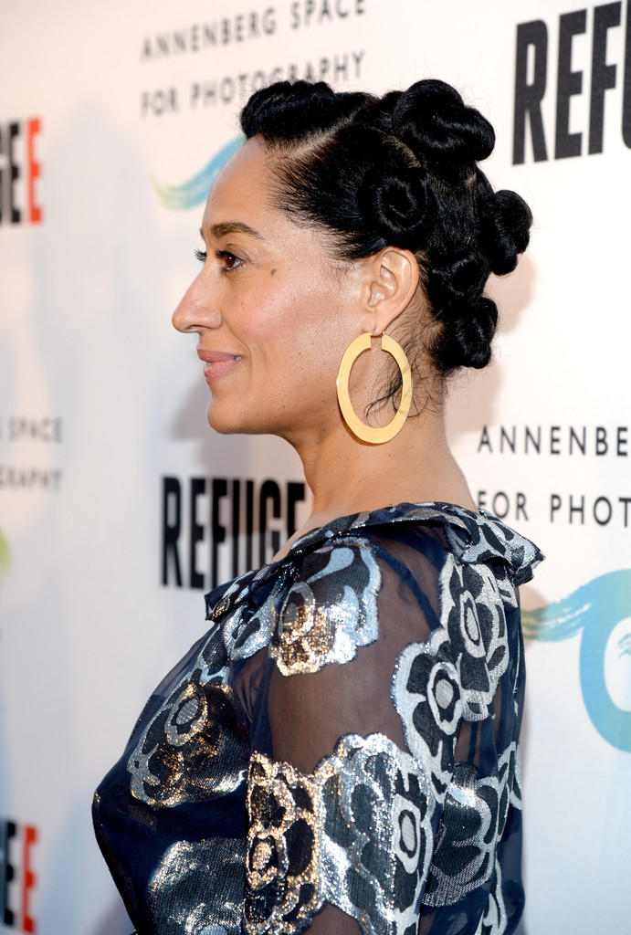 Tracee Ellis Ross hit up the Refugee premiere at the Annenburg Center for Photography clad in some stylish hoop earrings, Bantu knots, and a SUNO Fall 2016 floral navy Bubble ruffle maxi dress: